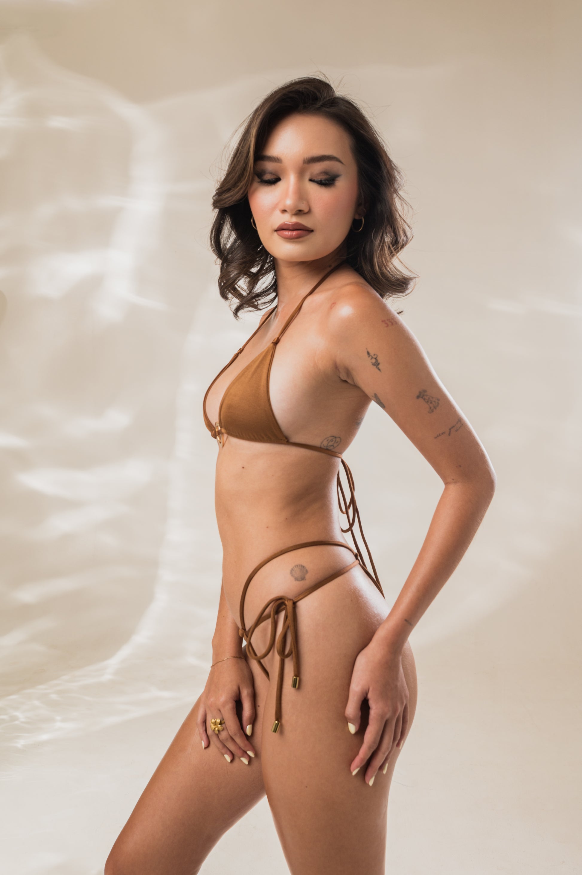 The Saudade bottom in Cinnamon is designed to enhance and embrace your natural curves. It features a flattering fixed strap that sits on your waist, paired with an adjustable tie strap for a snug, comfortable fit around the hip. Finished with elegant gold accents on the ties and a cheeky, confidence-boosting cut. This bottom brings just the right balance of sexy and secure.